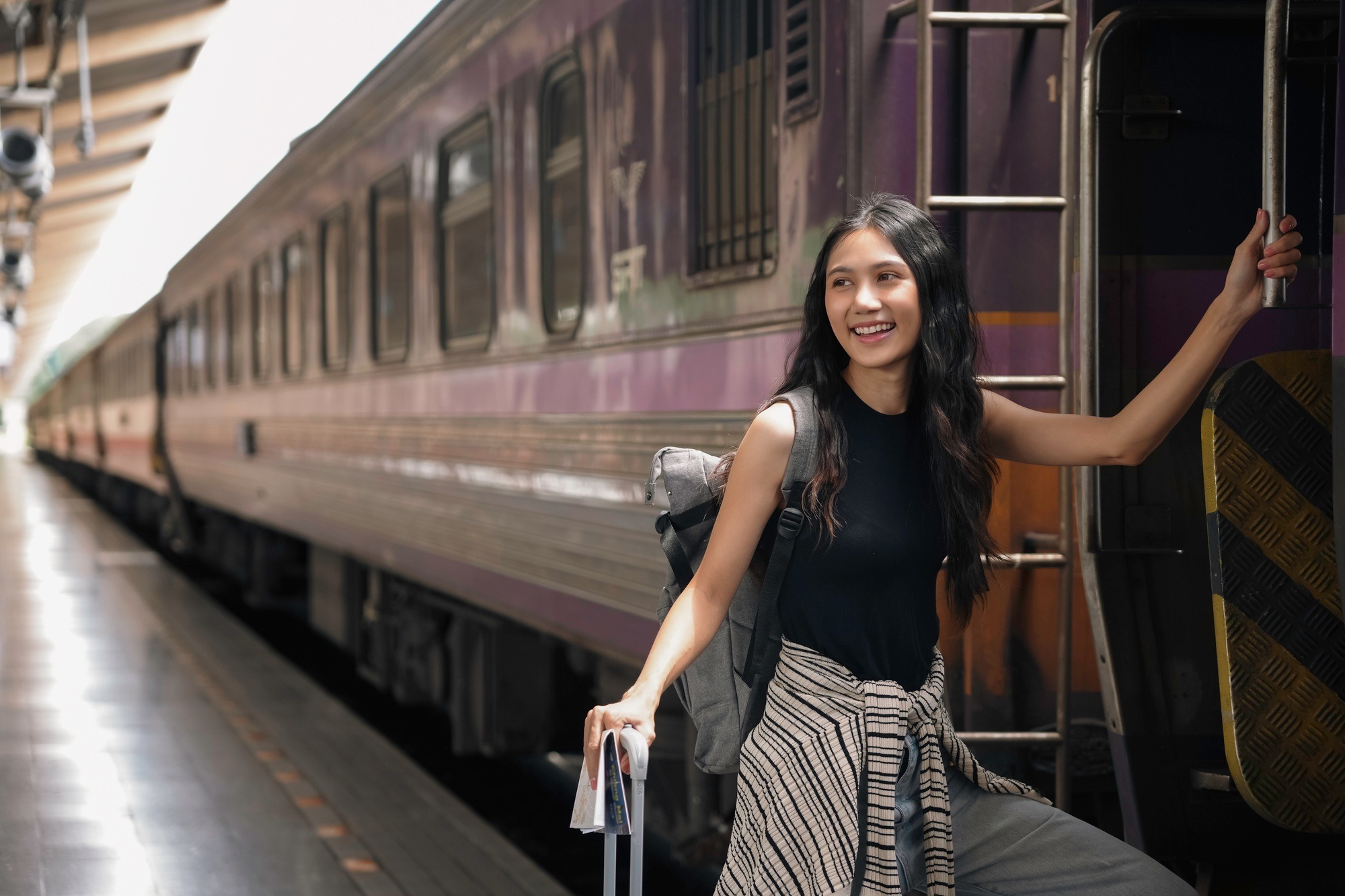 Young woman is boarding a train for her travel, she is smiling and holding the handrail