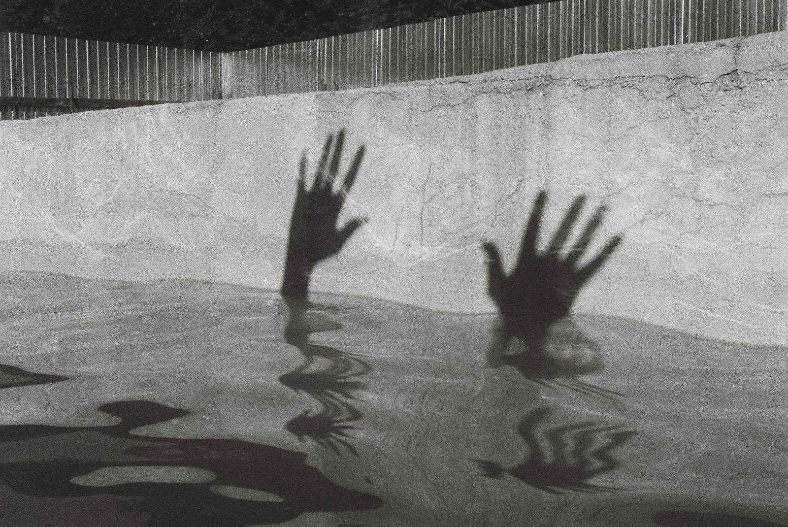 person in water in grayscale photography
