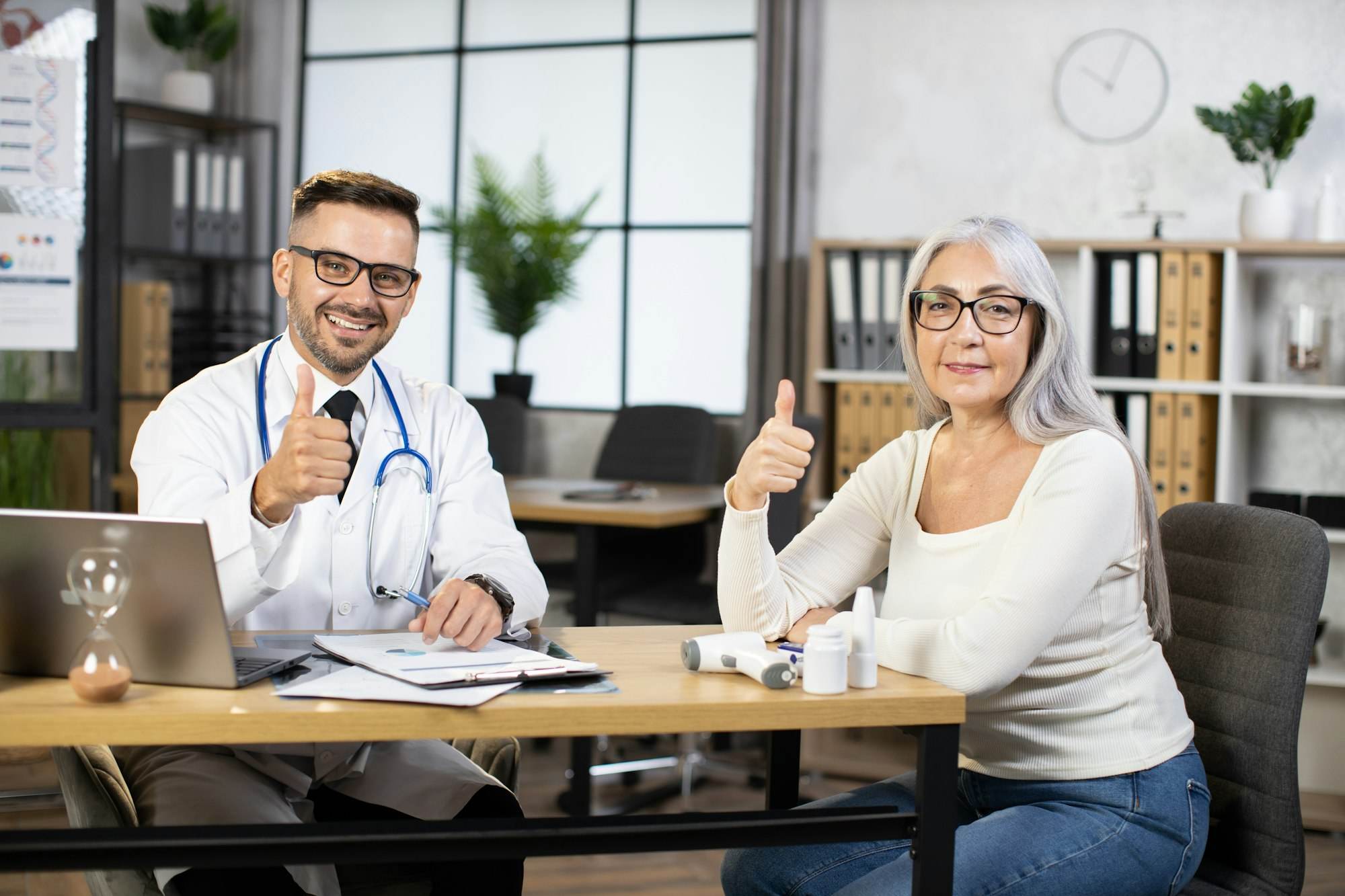 Doctor and patient showing thumb up and smiling on camera